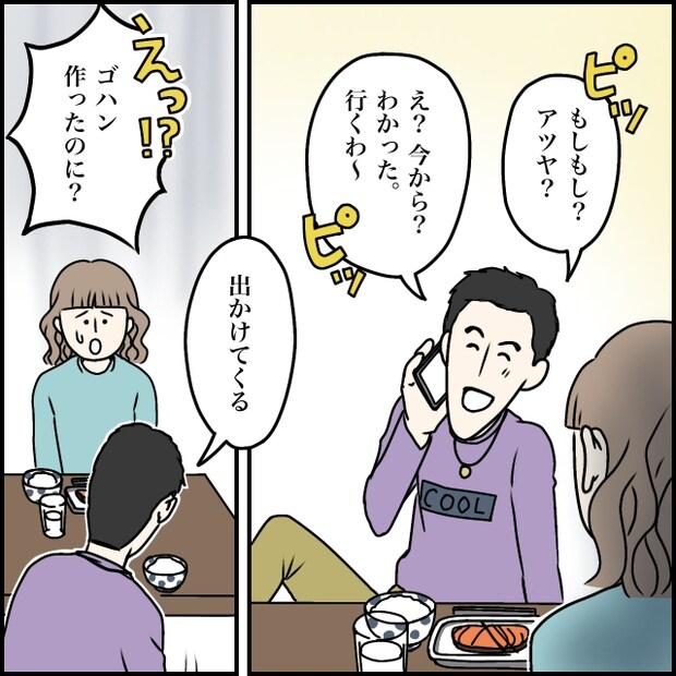 そして「もしもし?アツヤ?え?今から?わかった。行くわ~」満面の笑みでそう話した後、「出かけてくる」とタカシが言い、「えっ!?ゴハン作ったのに?」と驚く私に、