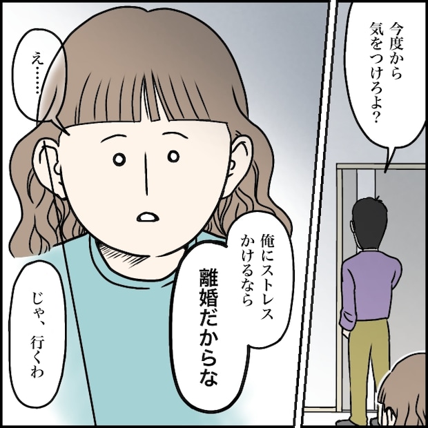 さらに、「今度から気をつけろよ?俺にストレスかけるなら『離婚』だからな」タカシの言葉に「え・・」と固まる私。そんな私を置いて「じゃ、行くわ」とタカシは出て行ってしまいました。