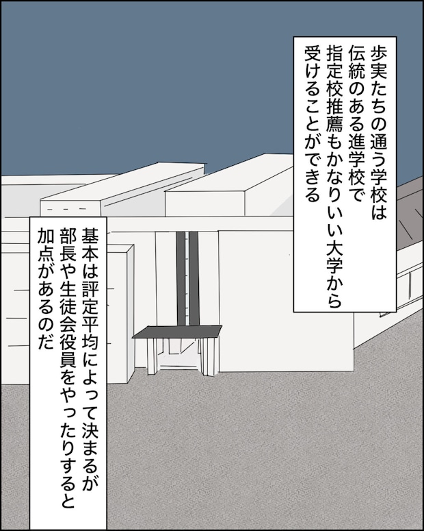歩実たちの通う学校は、伝統のある進学校で、指定校推薦もかなりいい大学から受けることができ、基本は評定平均によって決まるが、部長や生徒会役員をやったりすると加点があるのでした。