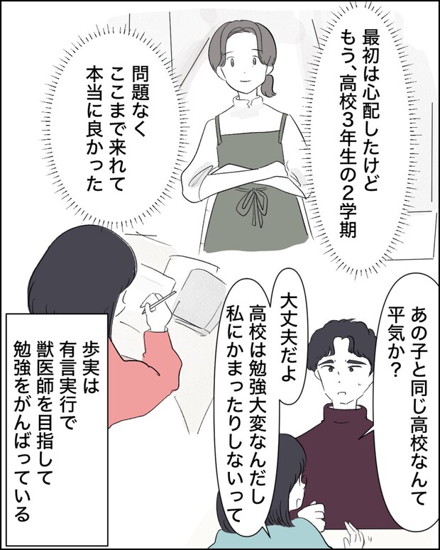 「最初は心配したけどもう、高校3年生の2学期、問題なくここまで来られて本当によかった」いじめらしいことも怒らず、大学入試に向け努力する歩実ちゃんに、「あの子と同じ高校なんて平気か?」と言われ、「大丈夫だよ。高校は勉強大変なんだし、私にかまったりしないって」歩実の言葉を聞いて少し安心した私は、獣医師を目指してがんばっている歩実を見つめていました。