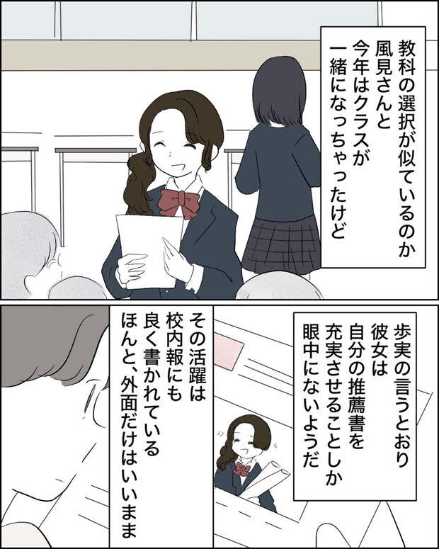 歩実と風見さんの教科の選択が似ているのか、今年はクラスが一緒になってしまったけれど、歩実の言う通り、風見さんは自分の推薦書を充実させることしか眼中にないようで、その活躍は校内報にも良く書かれている。ほんと、外面だけはいいままと呆れるほどでした。