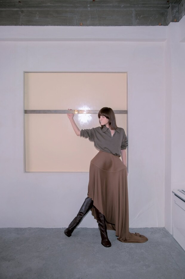 ニットポロシャツ¥213,000、スカート¥284,000、ブーツ¥271,000(全てフィービー ファイロ)