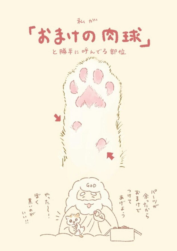 主要な肉球から少し離れたところにある小さなポッチは【手根球】というそうです。そういえば知らないなあ…と、家庭での独自の呼び名を付けることもありますよね。類さんが想像して描いた神様と猫ちゃんのやり取りがかわいくて、ほっこり癒されました!