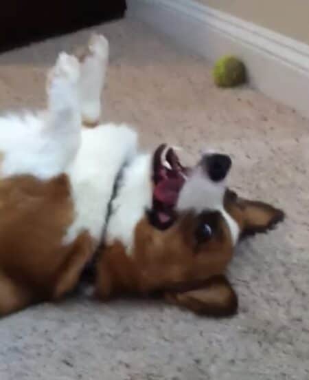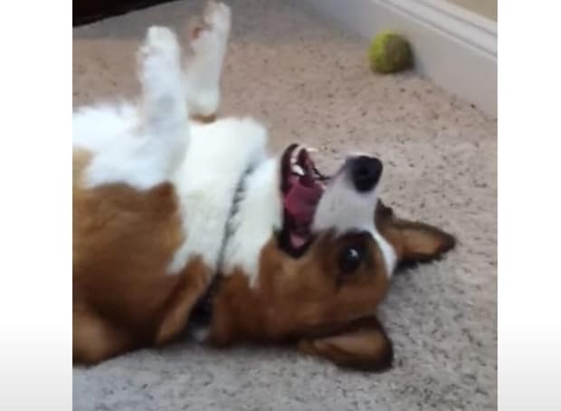 ボールで遊んでいるコーギーさん。