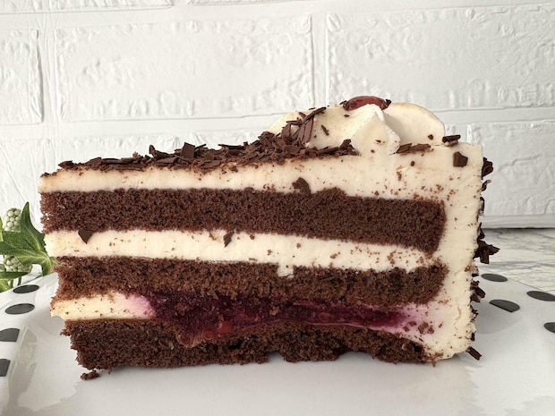 ココアスポンジとクリームの層が何層にも重なっています。下の層はチェリーを煮崩したようなソースがサンドされています。思ったよりも丁寧な作りにちょっとびっくり。