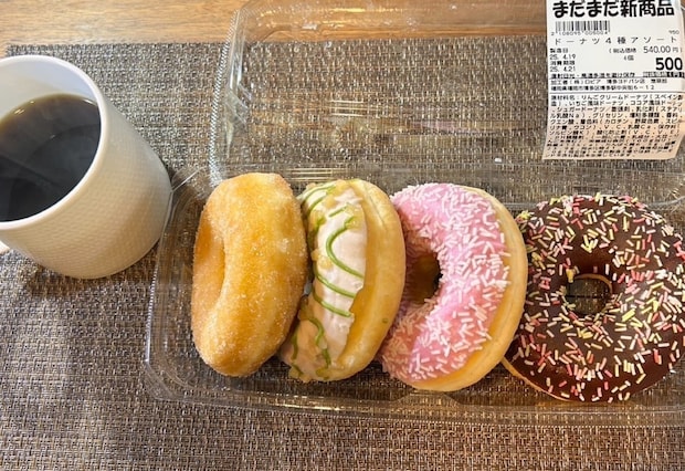 見るだけでワクワクする、ロピアの「ドーナツ4種アソート」。購入した商品は、4つの味が楽しめて540円(税込)という、お得感満載のセットです。