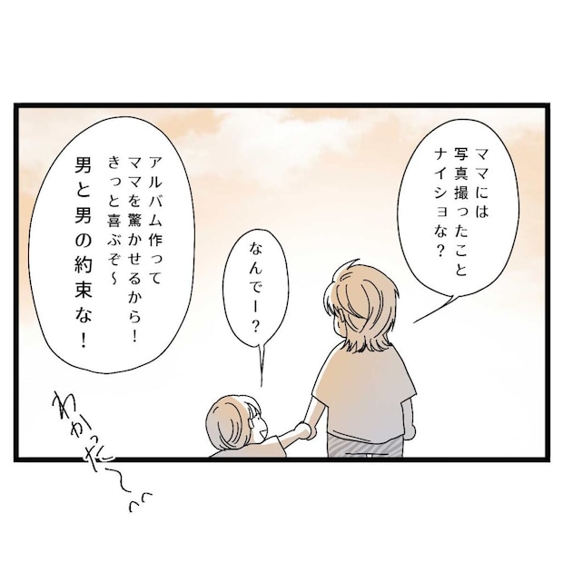 公園からの帰り道。「ママには写真撮ったことナイショな?」と話す信也さんに、コウキくんは「なんでー?」と無邪気に聞き返します。すると信也さんは「アルバム作ってママを驚かせるから!きっと喜ぶぞ~男と男の約束な」と言い、夕暮れの道を並んで歩いていったのでした。