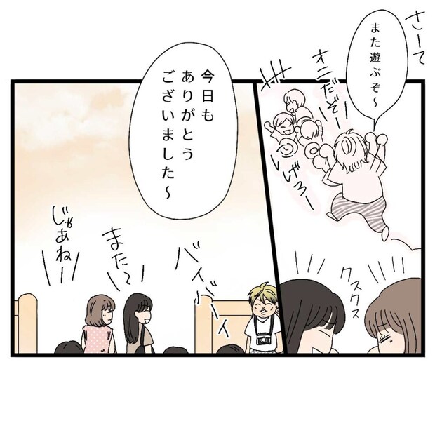 信也さんはグループチャットが作られたのを確認すると、「さ~て、また遊ぶぞ~!」と声を上げ、子どもたちとおにごっこを開始。いっぱい遊んで、気づけば時刻はすっかり夕方になっていました。「今日もありがとうございました~」信也さんはママ友たちと和やかに挨拶を交わして解散します。