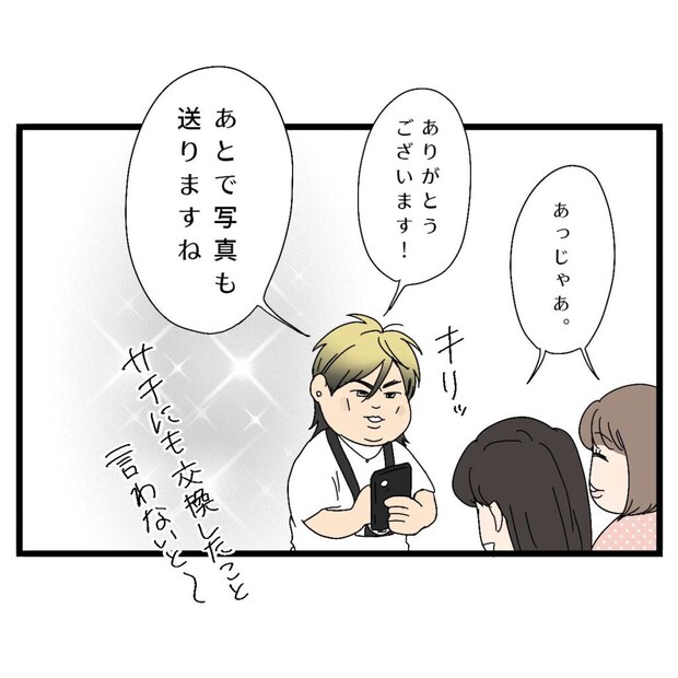 ママ友たちは特に疑うことなく信也さんと連絡先を交換し、グループチャットを作成します。信也さんはお決まりのキリッとした表情で「ありがとうございます!あとで写真も送りますね」とお礼を言い、「サチにも連絡先を交換したこと言わないと~」とわざとらしくつぶやきました。
