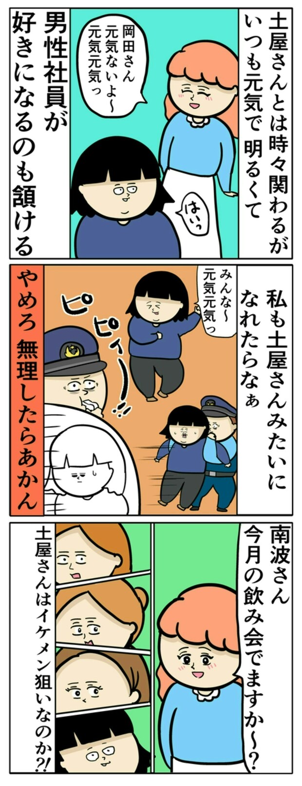 土屋さんのおかげで、南波さんが飲み会に参加するという情報を手に入れます。岡田さんの同僚3人は気合が入ります。しかし、それと同時に土屋さんも南波さん狙いだということが判明し、思わず固まってしまいました。