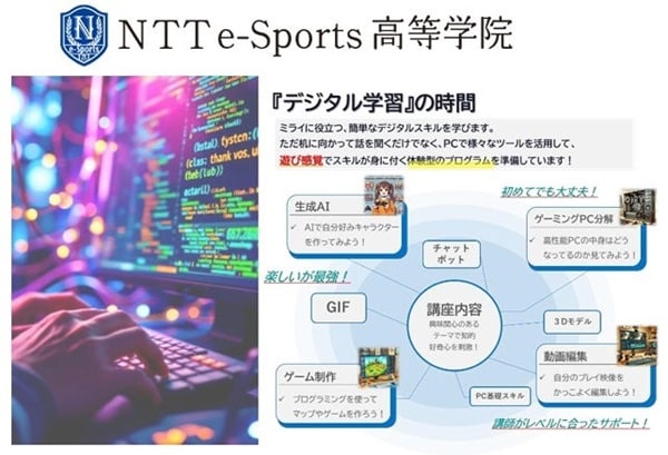また、NTTe-Sports高等学院では、eスポーツと親和性の高いデジタル学習に力を入れており、フリースクールにおいてもNTTe-Sports高等学院のカリキュラムメソッドを活用した学習プログラムを提供する。プログラミングや動画編集など、将来にもつながるデジタルスキルを学べる内容であり、生徒のeスポーツへの興味・関心から自然に学びへとつながるカリキュラムとなっている。