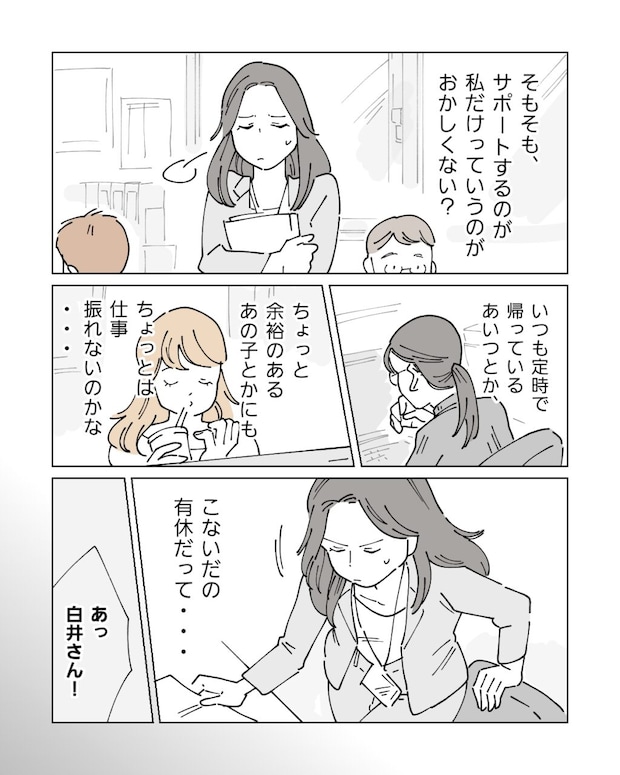 独身で子どもがいないという理由から、ワーママさんの『シワ寄せ役』にされていることに不満を抱く白井さん。早退した同僚の仕事を毎回引き受けさせられたり、申請した有休を何度も変更させられたり・・・一度きりならまだしも、重なれば重なるほど不満が募ってしまうのも無理はありません。頭では「仕方がない」と理解していても、割り切れない気持ちが残ってしまいますよね。