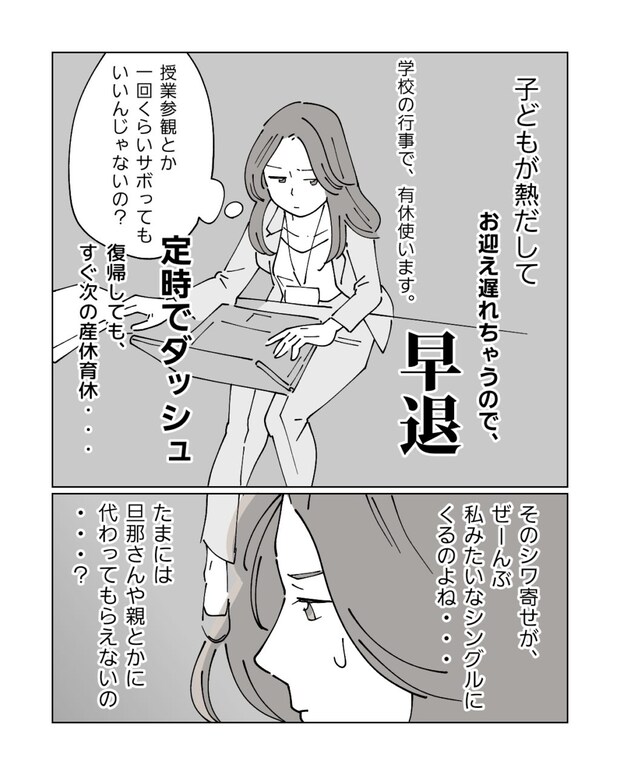 子どもの発熱、学校行事、そして復帰してすぐ次の産休育休・・・そのシワ寄せは全部私のようなシングルに回ってきます。子どもは体調を崩しやすいって聞くし、学校行事に参加せざるを得ない事情も理解はしています。それでも、たまには旦那さんや親に代わってもらえないのかなと思ってしまいます。