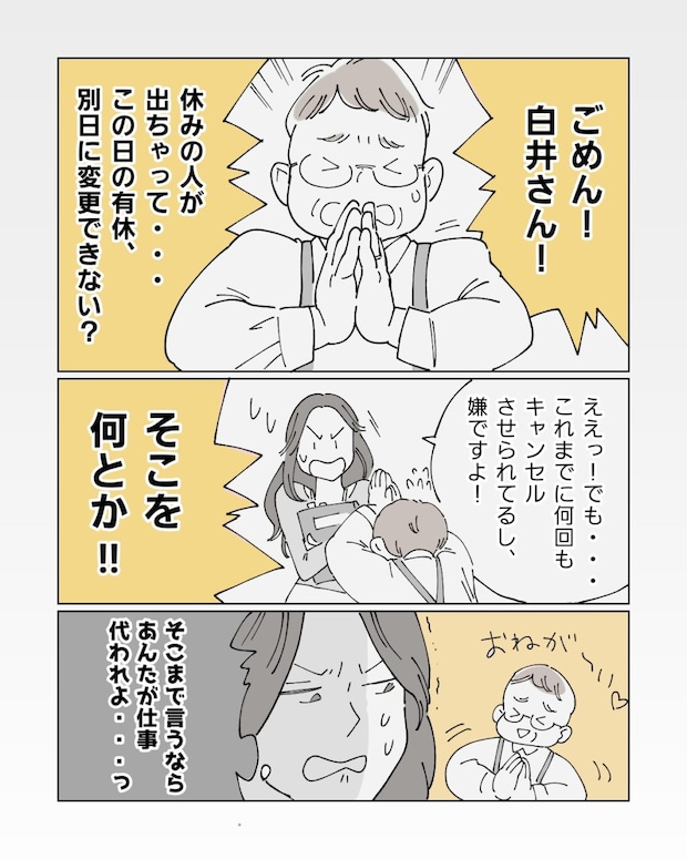 「ごめん白井さん!休みの人が出ちゃって・・・この日の有休、別日に変更できない?」と申し訳なさそうに手を合わせる部長。「ええっ!これまでに何回もキャンセルさせられてるし嫌ですよ!」そう断りましたが、「そこを何とか!」と半ば強引に押し切られ、結局申請していた有休は別日に変更されてしまいました。
