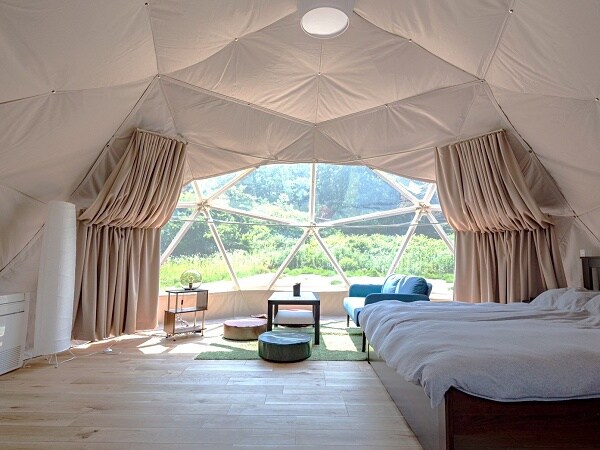 古民家に隣接するドームテントは、母屋とは独立したプライベート空間。母屋と合わせ、最大12名が思い思いの場所でくつろげる、他にはない“グランピングのできる古民家宿”だ。