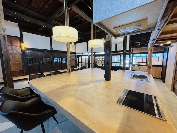 「いにしえの宿おへそ」では、大人数でも快適に使える広々としたキッチンとダイニングスペースを用意。調理器具、調理家電、食器類も完備しており、グループでの自炊を楽しむことができる。地元の農産物を直売所で購入し、古民家のキッチンで調理する“地産地消”の食体験も魅力の一つだ。