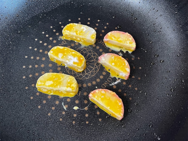 3. フライパンにゴマ油を入れて中火で熱し、1のかまぼこを並べる。片面を約3分焼いて焼き色がついたら裏返し、もう片面も同様に3分ほど焼く。