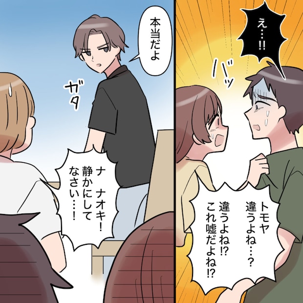 「え・・!!」みるみる青ざめるトモヤに、「トモヤ違うよね・・?違うよね!?これ嘘だよね!?」と詰め寄ると、「本当だよ」そう言って立ち上がるナオキさんを見て、「ナ、ナオキ!静かにしてなさい・・!」と義母が慌てて止めに入りました。