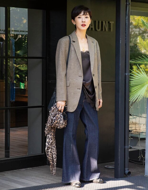 端正なテーラードジャケット×きれいめデニムの王道スタイルも、インナーにレースを忍ばせるだけで印象は一変! 控えめな肌感と、ヒョウ柄ストールのスパイスが、きちんと感の中に女っぽさと今っぽさを添えてくれます。