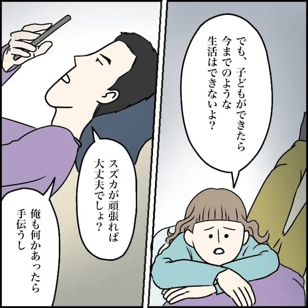 「でも、子どもができたら、今までのような生活はできないよ?」私が不安そうにそう言うと、「スズカが頑張れば大丈夫でしょ?俺も何かあったら手伝うし」と平然と言うタカシ。