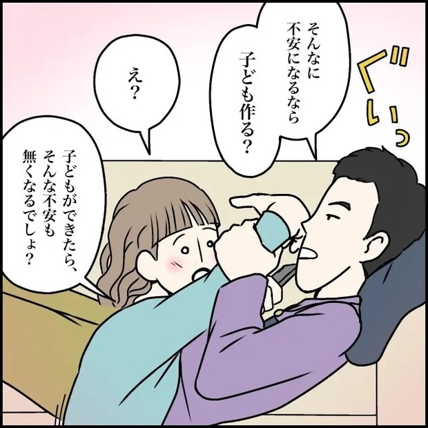 すると突然タカシに腕を掴まれて「そんなに不安になるなら子ども作る?」タカシの言葉に「え?」と思わず赤面する私。「子どもができたら、そんな不安も無くなるでしょ?」そう言われて、