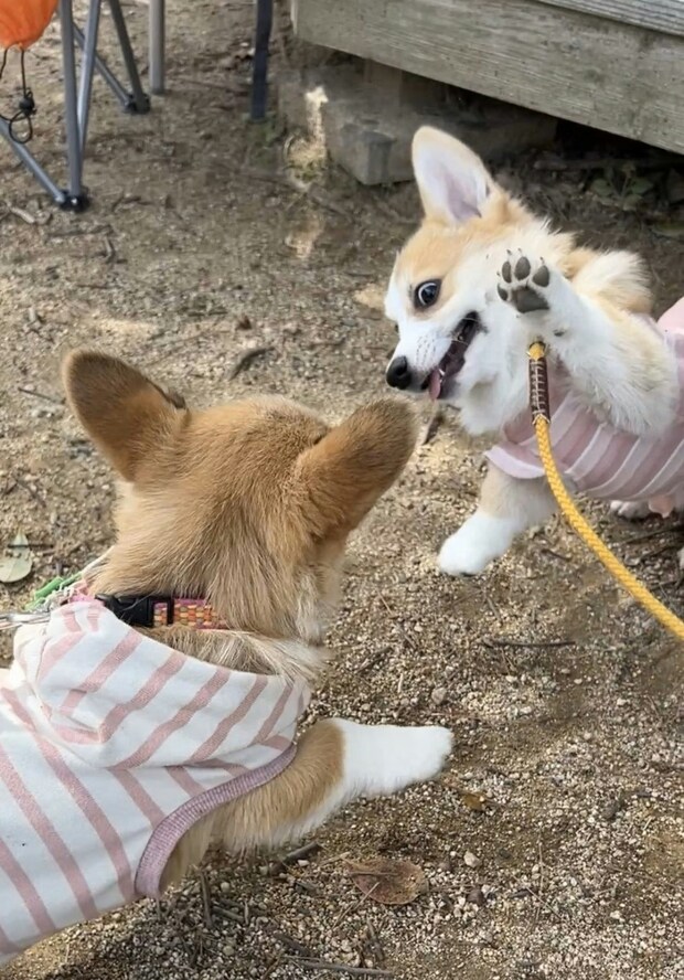 ケンカのはずなのに、こんなにも癒やされるのはなぜでしょうか。コーギー特有の手足の短さもあってか、余計に平和に見えてしまいます。まだまだきれいな肉球のパンチ。当たっても痛くなさそうですが、本人はとても真剣なはず。温かく見守ってあげたくなりますよね。