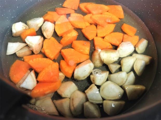 2. 別の鍋に1のだし汁、にんじん、ごぼうを入れて中火にかけます。