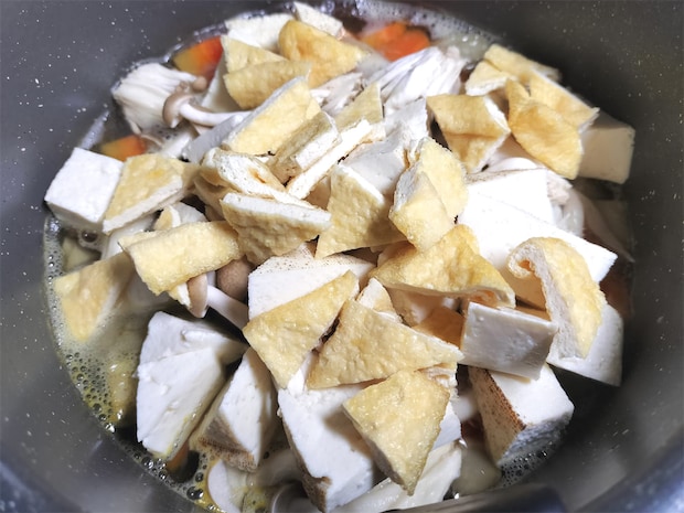 4. 2の鍋に油揚げ、焼き豆腐、かんぴょう、しめじを加えて煮ます。