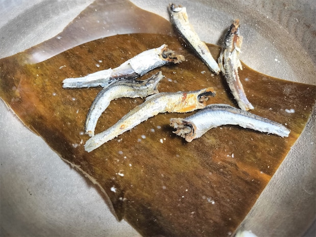 1. 水適量(分量外)、昆布、煮干しを入れた鍋を中火にかけ、沸騰したら弱火にして昆布を取り出し、5分煮たら火を止めます。