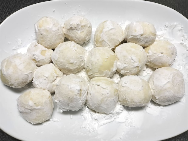 5. 3の生地を親指大くらいの大きさに分け、むきくるみを入れて中身が出ないように丸く成型します。