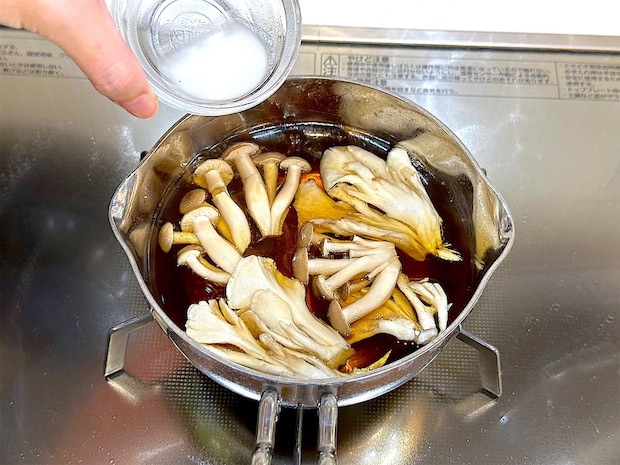 3. 合わせ調味料を鍋に入れ、沸いてきたらきのこを加えて煮る。