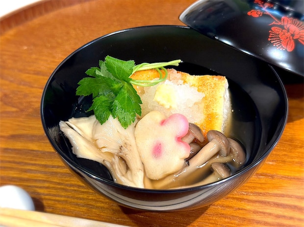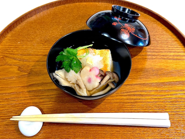 お椀にお餅がべったりつくと食べにくいし、後で洗うのも大変…。そんなときは、先に少量の具をお椀に入れておくと、底にお餅がくっつかず、高さも出るので盛り付けしやすいですよ。