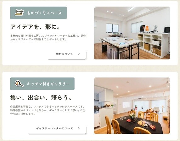 また、「アイデアを、形に。」するものづくりスペースや、「集い、出会い、語らう」ためのギャラリー・キッチンスペースなど、各エリアの設備や利用イメージを紹介している。