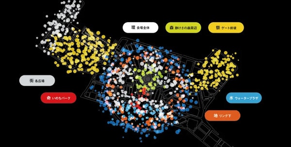 会場は「地・空・水・森・街・祭・命」という7つのエリアに分かれ、それぞれのテーマに沿って7名の作曲家が参加し、時間帯や天候、会場の状況に応じて音が変化する、生成的なサウンドスケープが万博会期を通して展開された。