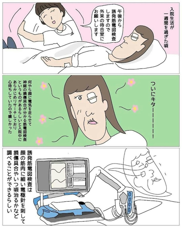 顔面麻痺の治療期間や損傷の度合いを調べるため、誘発筋電図検査を行います。これにより今後の経過が予想しやすくなるのです。