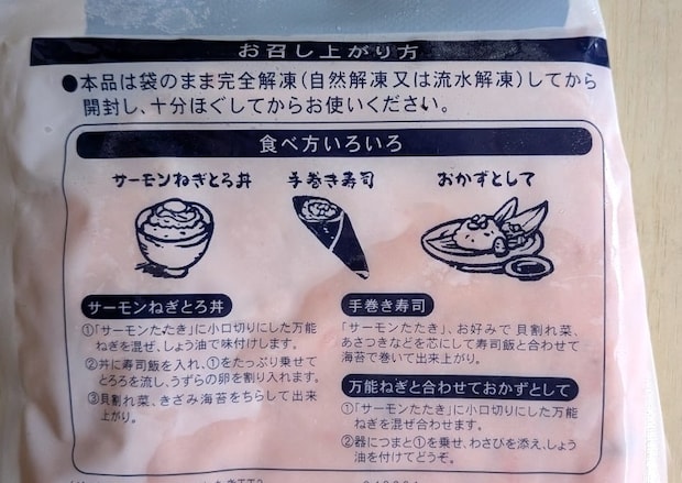 解凍してそのまま食べられる「炙りアトランティックサーモン」と「粗びきサーモンたたき」、加熱調理する「サーモンフライ」は、どれもしっかりと量があり、流石は業務スーパーです。