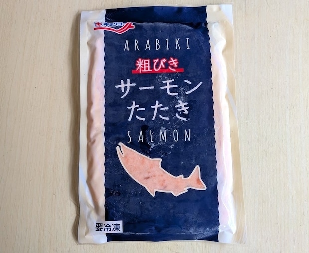 2つ目は、中身が見えるようにデザインされたサーモンのイラストが可愛らしい「粗びきサーモンたたき」です。
