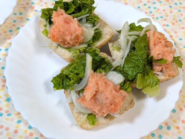 トーストした全粒粉パンに、サニーレタスと玉ねぎのマリネをのせ、その上に塩をちょっと足して混ぜたサーモンをトッピングして、オープンサンドにしてみました!