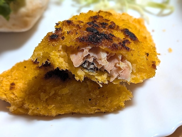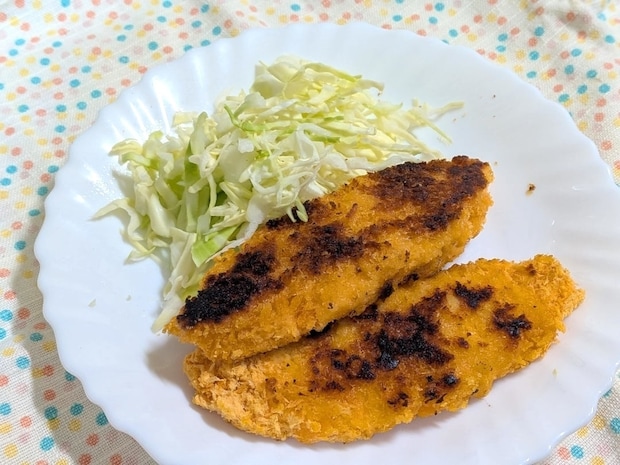 加熱すると衣の色が鮮やかになって、ホテルの朝食で見たことのあるような、サーモンフライができあがりました。