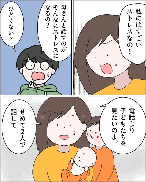 全く話が通じないマサオにイライラしてきて「私にはすごいストレスなの!」と声を荒げると、「母さんと話すのがそんなにストレスになるの?ひどくない?」と私を責めるマサオ。私は「電話より子ども達を見たいのよ。せめて2人で話して」と冷静に伝えました。
