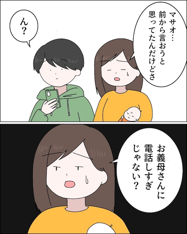 「そう?昔から仲良いし、普通じゃない?」ときょとんとするマサオに「普通かどうかはわからないけど・・電話する時、スピーカーで話すのもやめてくれない?」と思い切って伝えました。