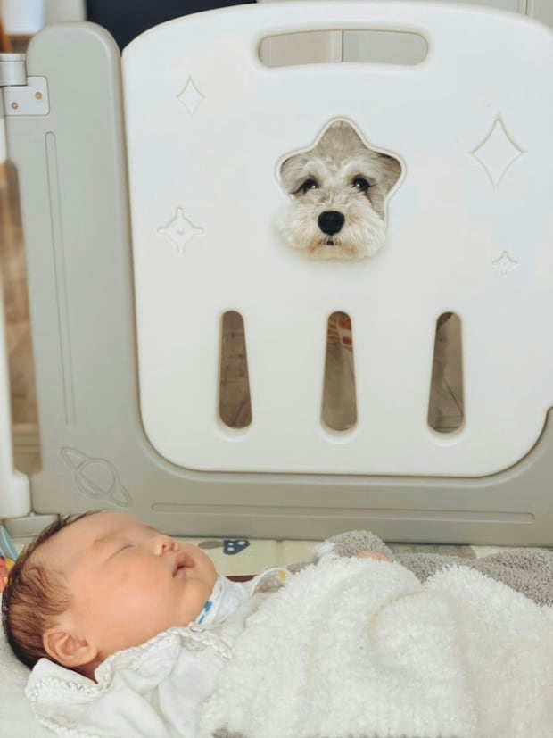 すやすや眠る赤ちゃんを見守っているのはミニチュアシュナイザーのこんぶちゃん。ベビーゲートの星形の部分から顔を出す姿は、かわいらしいですよね。「赤ちゃんを守る!」と言わんばかりの表情も心強く感じます。