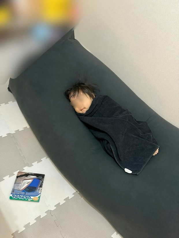 1週間保育園を頑張った息子くんが、ブランケットにくるまり大きなクッションの上で横になっている写真。ミノムシのようなその見た目が、愛らしいですよね。