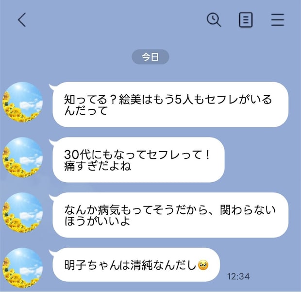 「知ってる?絵美はもう5人もセフレがいるんだって。この間、自慢気に話してた。30代にもなってセフレって!痛すぎだよね。なんか病気もってそうだから関わらないほうがいいよ。明子ちゃんは清純なんだし」