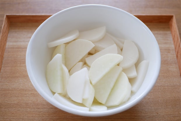 1. 大根は皮をむき、1cm厚さの半月切りにする。