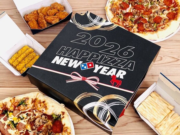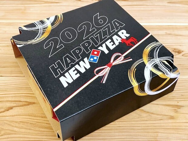 「お重型ボックス」には、「2026 HAPPIZZA NEW YEAR」の文字と、2026年の干支である「午」のイラスト入り。黒地にゴールドやホワイトでお正月らしい模様も描かれており、スタイリッシュかつゴージャスな雰囲気を醸し出しています。