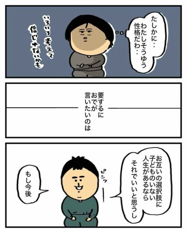 そして「お互いの選択肢に子どものいない人生があるなら、それでいいと思うし」と、本当に言いたかったことを伝えます。