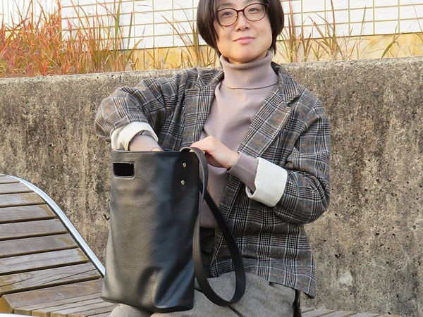 「Jumelles-ジュメル-3WAYトート」をデザインしたのは、坂元恵さん。大学でビジュアルデザインを学び、印刷会社の勤務ではクライアントの意向を汲んだ広告デザインの制作を行っていたが、「自分一人で完結できる仕事」の理想を抱き、鞄づくりの世界へ飛び込んだ。2024年春に「Toyooka KABAN Artisan School」へ入学し今回のデザインを考案。卒業後の2025年春からは、豊岡鞄も生産する製造企業のナオトで生産の現場を経験し、商品企画にも携わっている。