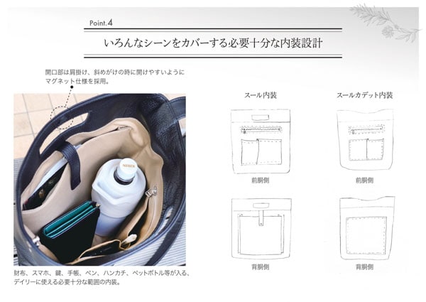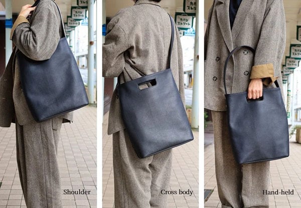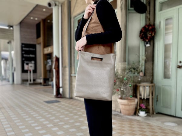 手持ち、肩がけ、斜めがけができるように設計されており、きれいめのファッションや、オフィスカジュアルにも合うシンプルなデザインに仕上がっている。