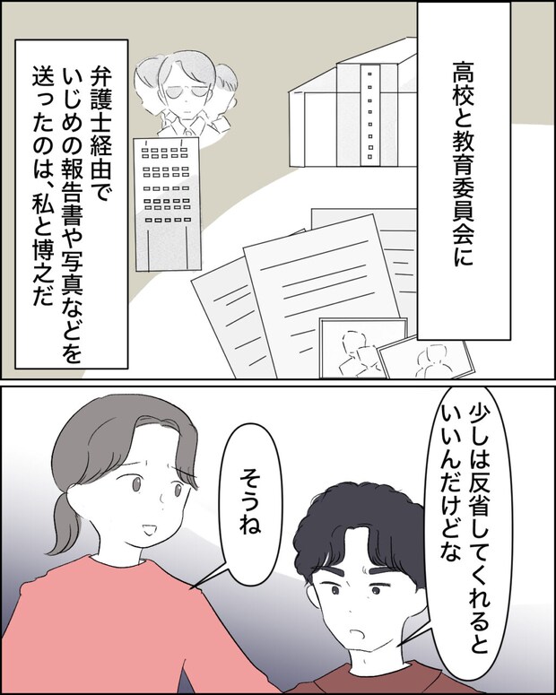 実は博之と私は、歩実たちが通う高校と教育委員会に、弁護士経由で風間さんによるいじめの報告書やそれを証明する写真や音声を送っていたのです。これで少しは反省してくれるといいけれど・・・つぶやく博之に相槌を打ちながら、あの子の性格だと難しいかもと思ってしまう私です。